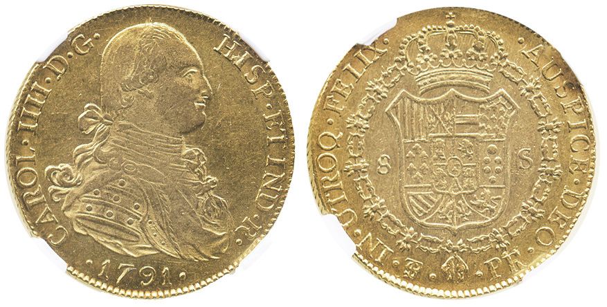 Potosi, Bolivia, bust 8 escudos, Charles III, 1791PR, non-laureate bust, rare (missing in Eliasberg), encapsulated NGC AU 55, finest known graded by NGC. KM-81; CT-97. First year of non-laureate type, fully lustrous and problem-free.