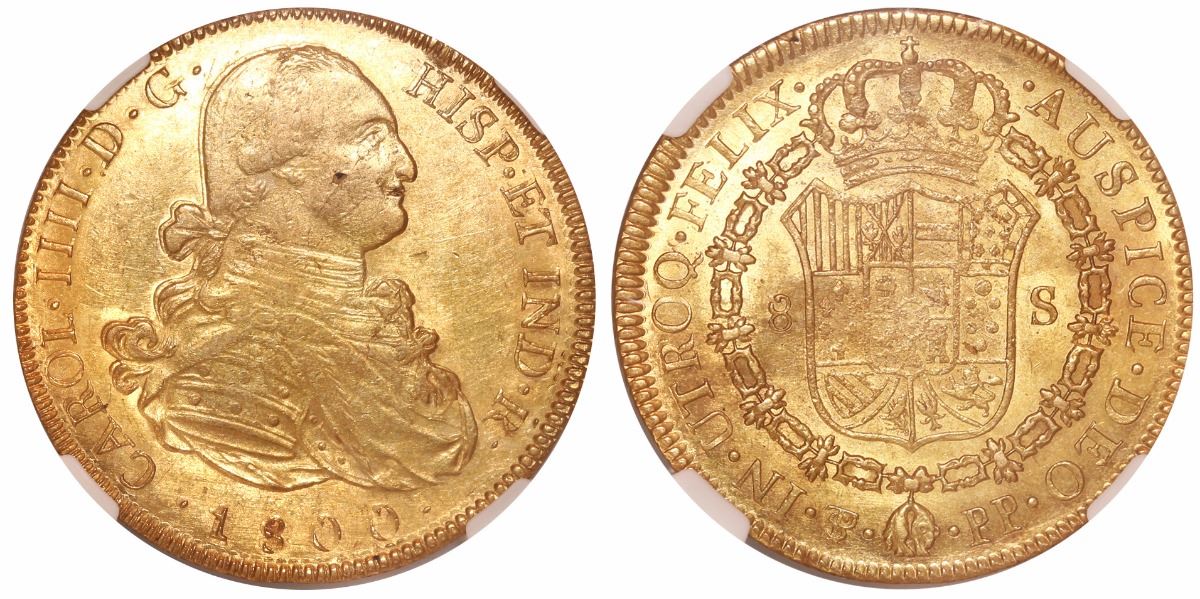 Potosi, Bolivia, bust 8 escudos, Charles IV, 1800PP, encapsulated NGC AU 55. CT-107; KM-81. Lustrous and lightly red-toned, typically weak in centers.