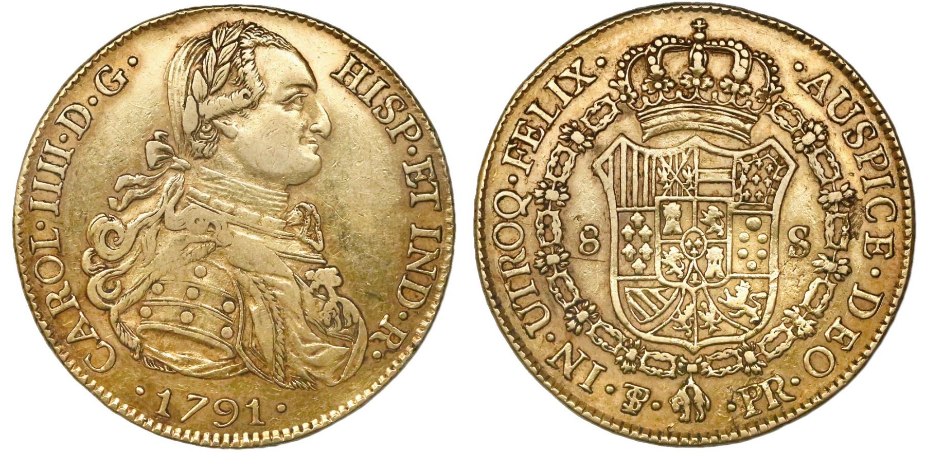 Potosi, Bolivia, bust 8 escudos, Charles IV, laureate bust, 1791PR, rare. CT-95; KM-77. 26.95 grams. Well-detailed XF with red toning around features, no problems, very acceptable example of a rare one-year type that bears a laurel wreath in the king's hair.