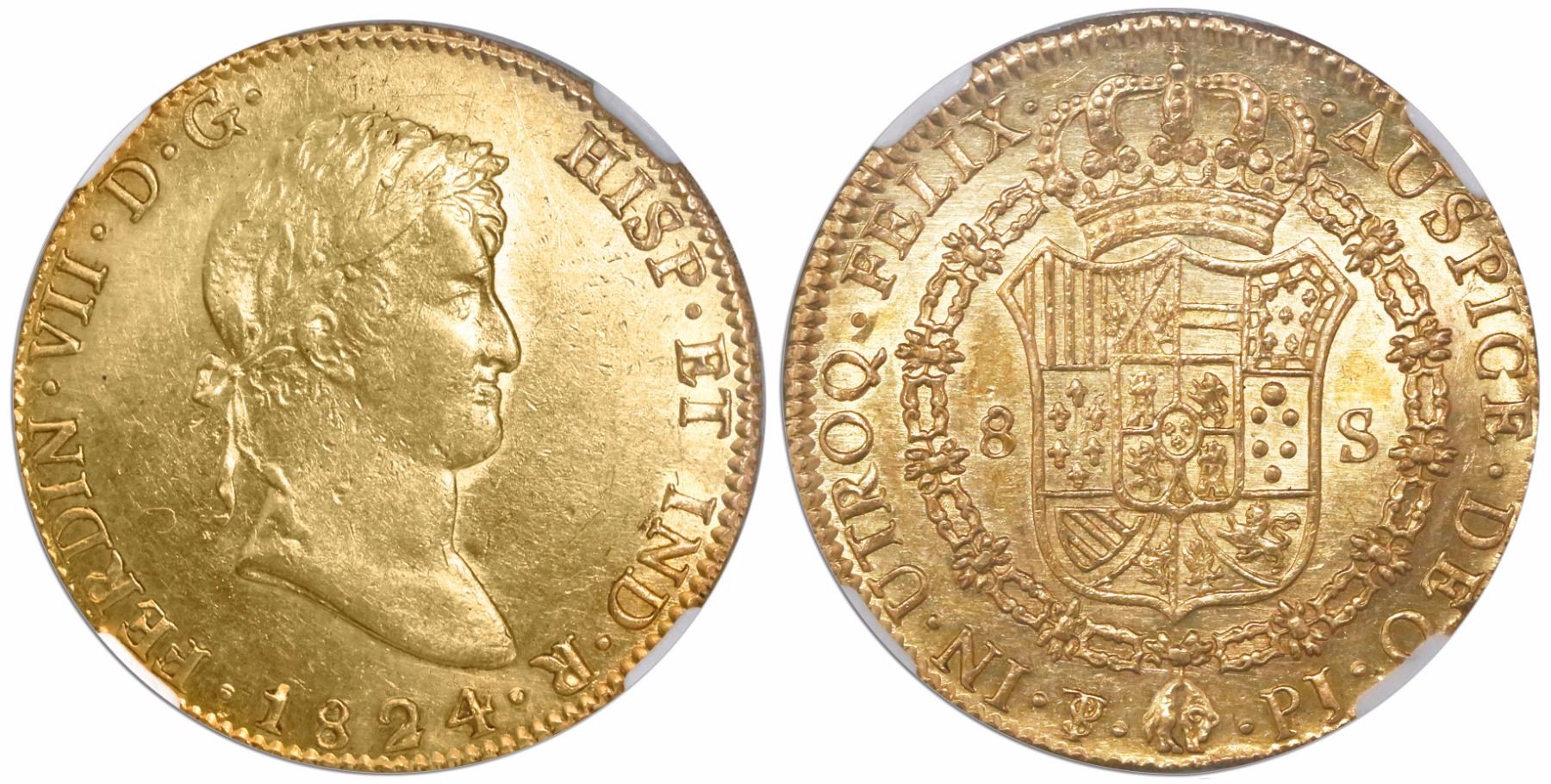 Potosi, Bolivia, bust 8 escudos, Ferdinand VII, 1824PJ, encapsulated NGC AU 50. CT-90; KM-91. Lustrous and well struck (actually Mint State in our opinion, but with faint surface hairlines on obverse) and rare (only 6,470 struck, the second lowest production figure in 8E after the initial issue of 1778), also important and desirable as the final date of colonial gold struck at this mint. NGC #3313407-002.