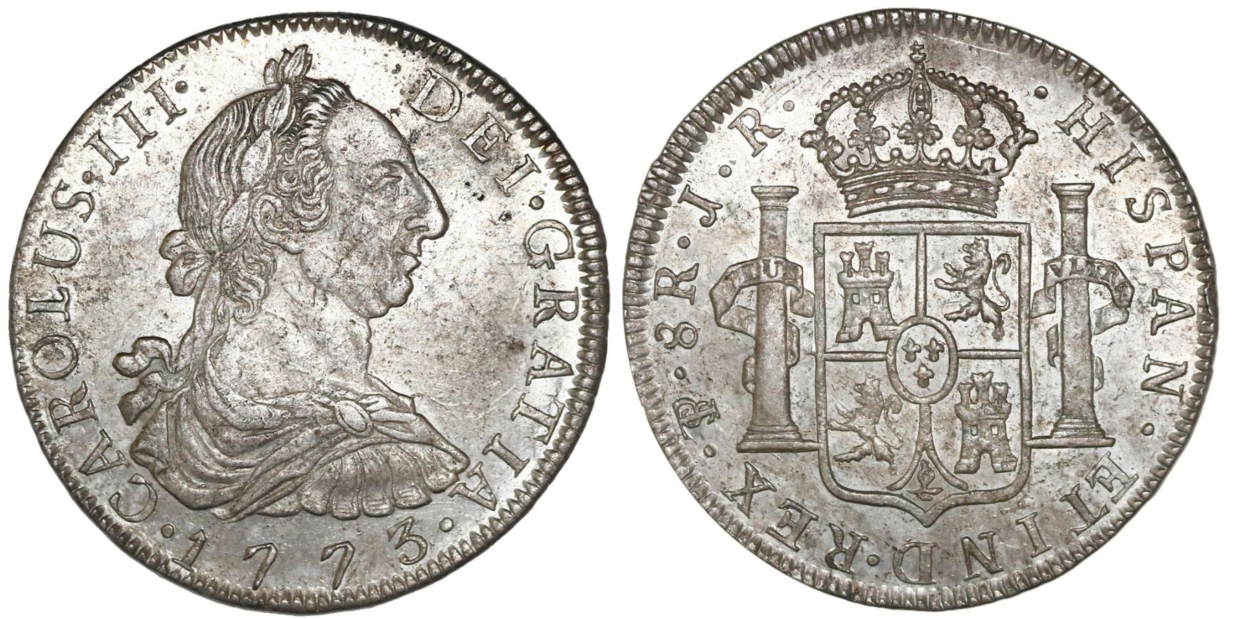 Potosi, Bolivia, bust 8 reales, Charles III, 1773JR. KM-55; CT-973. 27.06 grams. Lustrous Mint State with minor bagmarks, starting to tone.