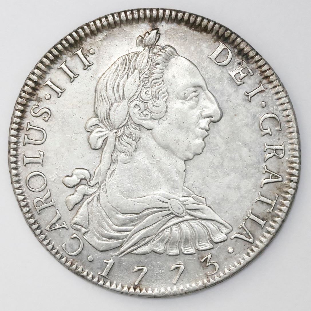 Potosi, Bolivia, bust 8 reales, Charles III, 1773JR. KM-55; CT-973. 27.13 grams. Bright and lustrous AU+ with light hairlines, first year of issue.