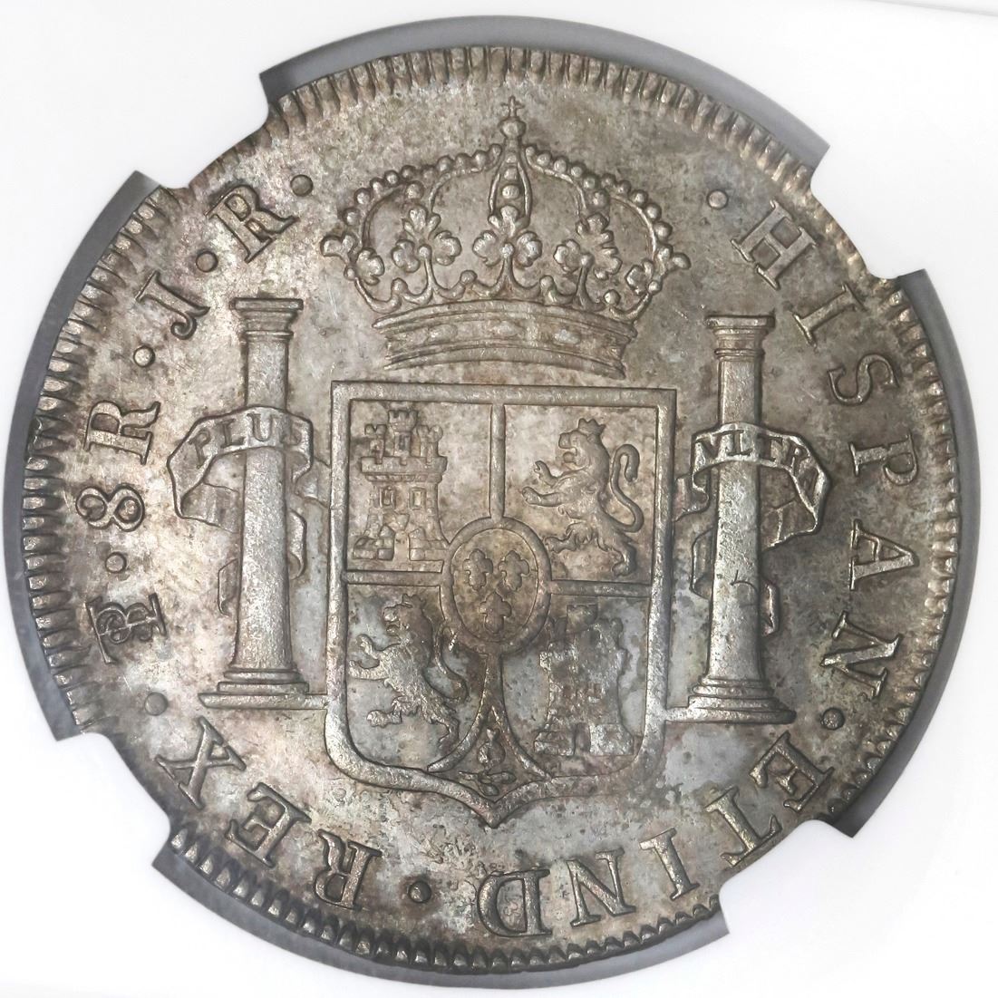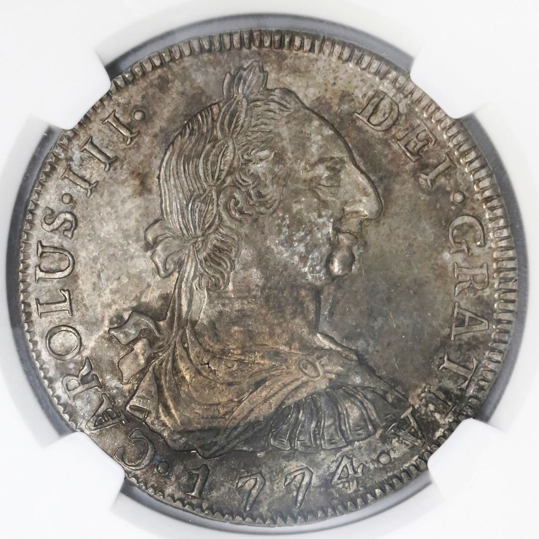 Potosi, Bolivia, bust 8 reales, Charles III, 1774JR, NGC MS 61. KM-55; CT-974. 26.99 grams. Mottled gold / grey toning over muted luster, some surface hairlines. NGC #4704300-001.