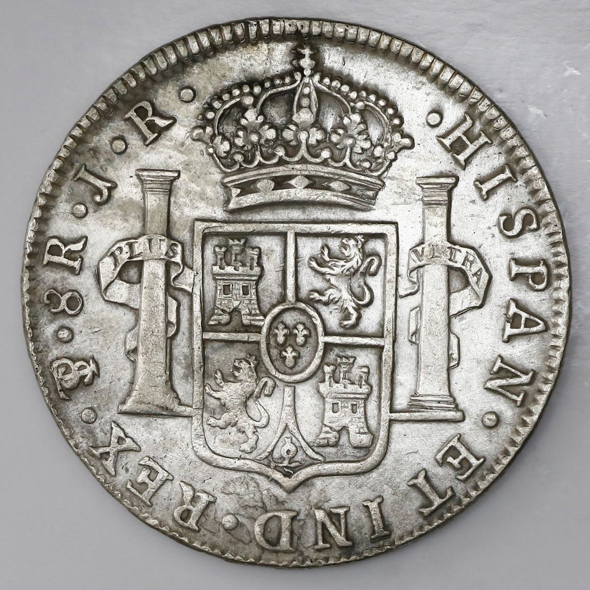 Potosi, Bolivia, bust 8 reales, Charles III, 1776JR. KM-55; CT-976. 26.83 grams. AU with weak bust but well-struck shield, subdued luster (brighter on the reverse), a few light hairlines in fields, better assayer for this year, popular as the date of US Independence.