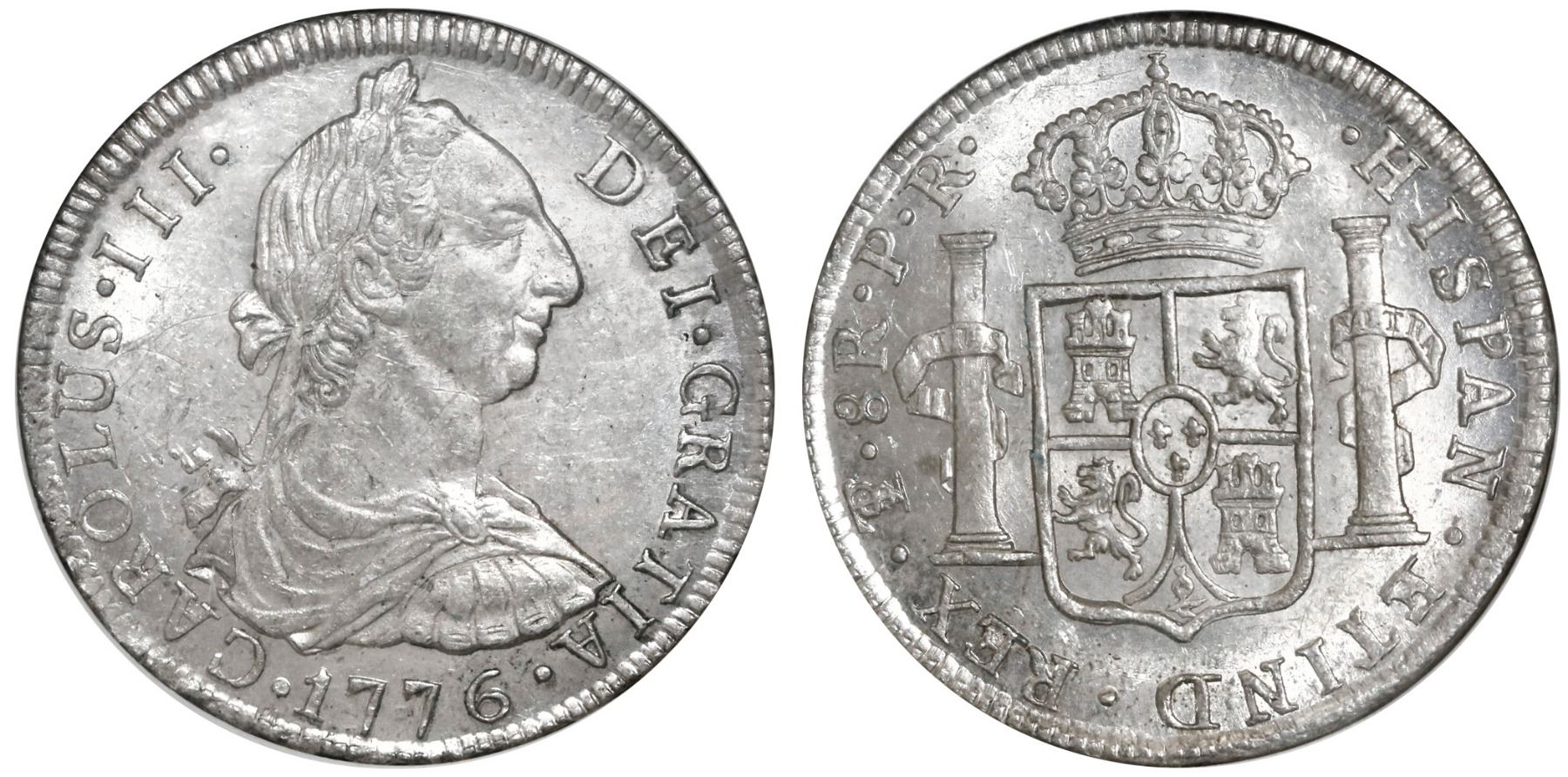 Potosi, Bolivia, bust 8 reales, Charles III, 1776PR, NGC MS 62, finest known in NGC census. KM-55; CT-977. Popular date for US collectors, bright and lustrous (no toning), with faint surface hairlines and imprint of a struck-through fiber behind head, "top pop" in NGC census among fourteen entries. Pedigreed to our Auction #6, with original lot-tag #1220. NGC #1520590-001.
