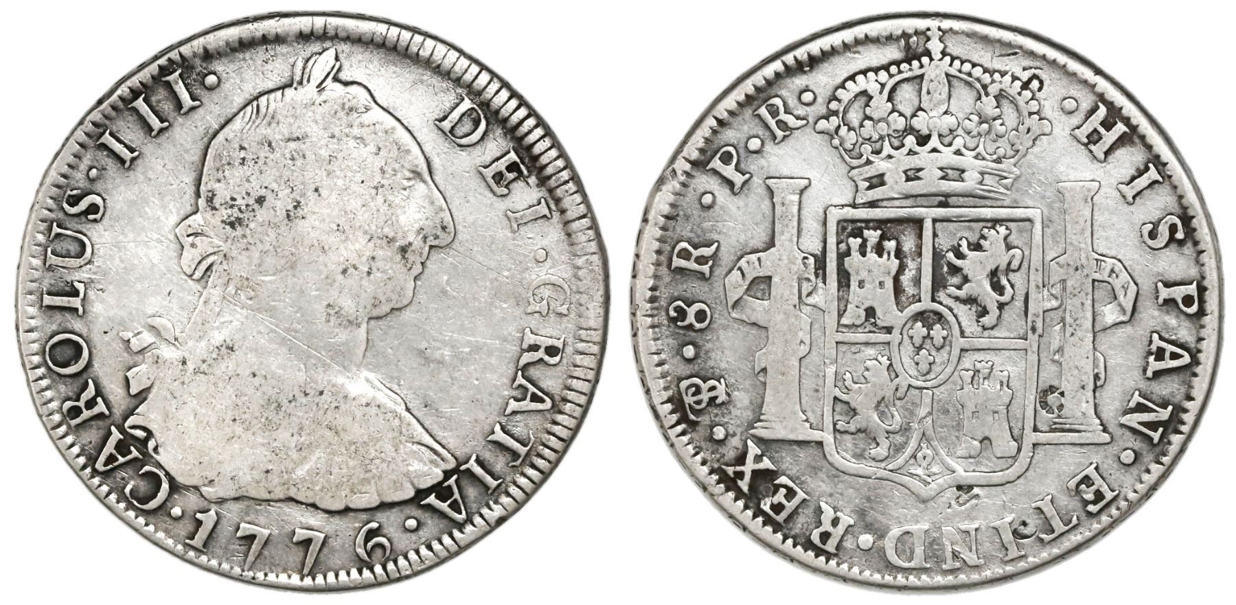 Potosi, Bolivia, bust 8 reales, Charles III, 1776PR. KM-55; CT-977. 26.19 grams. AVF with weak bust, toning around details, no big problems.
