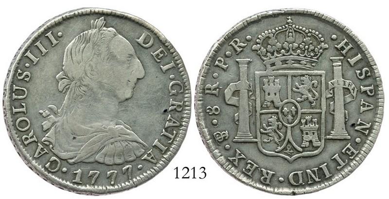 Potosi, Bolivia, bust 8 reales, Charles III, 1777PR. KM-55; CT-978. 26.7 grams. Bold Fine+ with contrasting toning around details. Pedigreed to the Mark Bir collection.