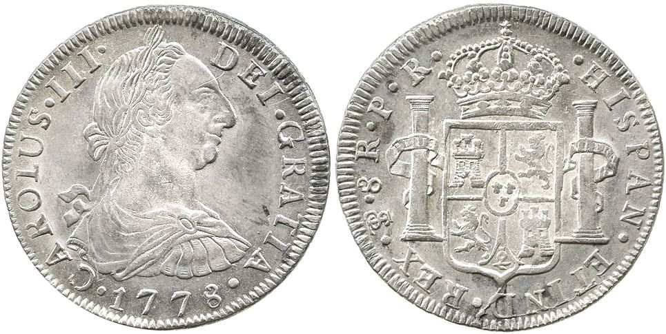 Potosi, Bolivia, bust 8 reales, Charles III, 1778PR. KM-55. 27.0 grams. Lustrous, almost prooflike Mint State with no problems except for small dark spots of toning, certainly the finest specimen we have ever offered and probably on par with the three MS specimens listed in the NGC census.