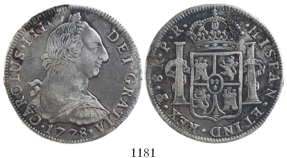 Potosi, Bolivia, bust 8 reales, Charles III, 1778PR. KM-55; CT-979. 26.67 grams. Bold VF with light toning (some dark spots), minor rim-flaw (as made).
