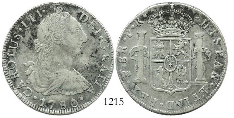Potosi, Bolivia, bust 8 reales, Charles III, 1780/9PR. KM-55; CT-981. 26.7 grams. AVF with spotty toning, no evidence of 8/7 for penultimate digit (as listed in KM) but the 0/9 is clear. Pedigreed to the Mark Bir collection.