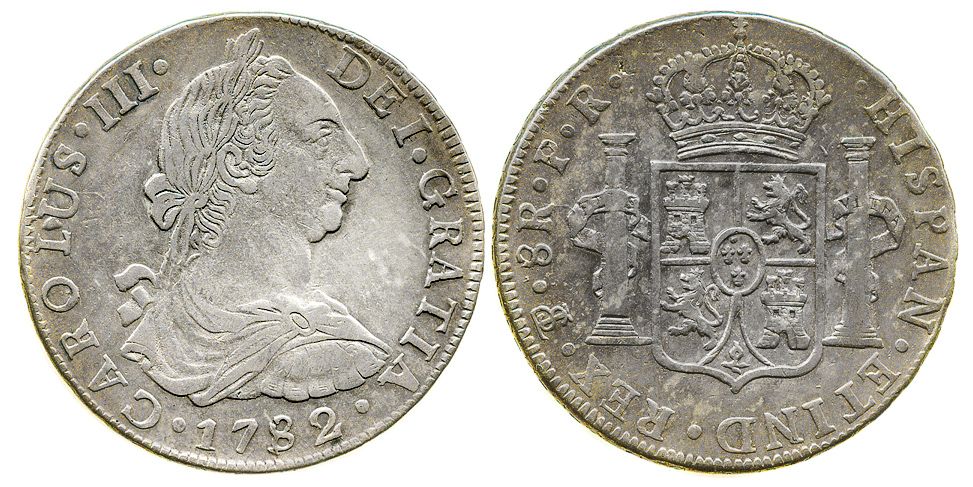 Potosi, Bolivia, bust 8 reales, Charles III, 1782PR. KM-55; CT-986. 26.9 grams. Richly rainbow-toned VF+, slightly off-center reverse with part of rim crude as a result. Pedigreed to our Auction #3, with lot-tag #709, and to Worldwide Coins of California auction #XXXIII, with lot-tag #334.
