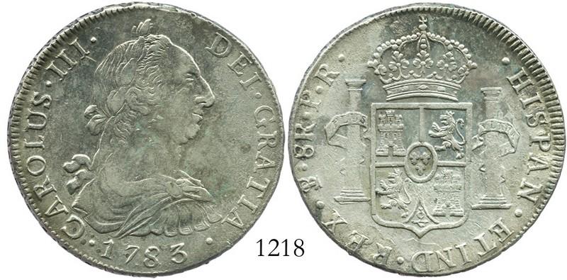 Potosi, Bolivia, bust 8 reales, Charles III, 1783PR. KM-55; CT-990. 26.7 grams. Lustrous XF, starting to tone nicely, very minor pitting here and there. Pedigreed to the Mark Bir collection.