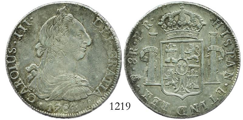 Potosi, Bolivia, bust 8 reales, Charles III, 1784PR. KM-55; CT-991. 26.9 grams. Bold VF+, richly toned.