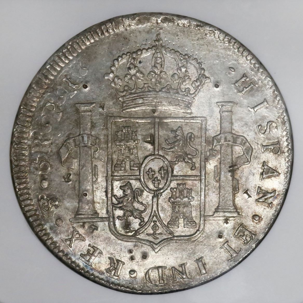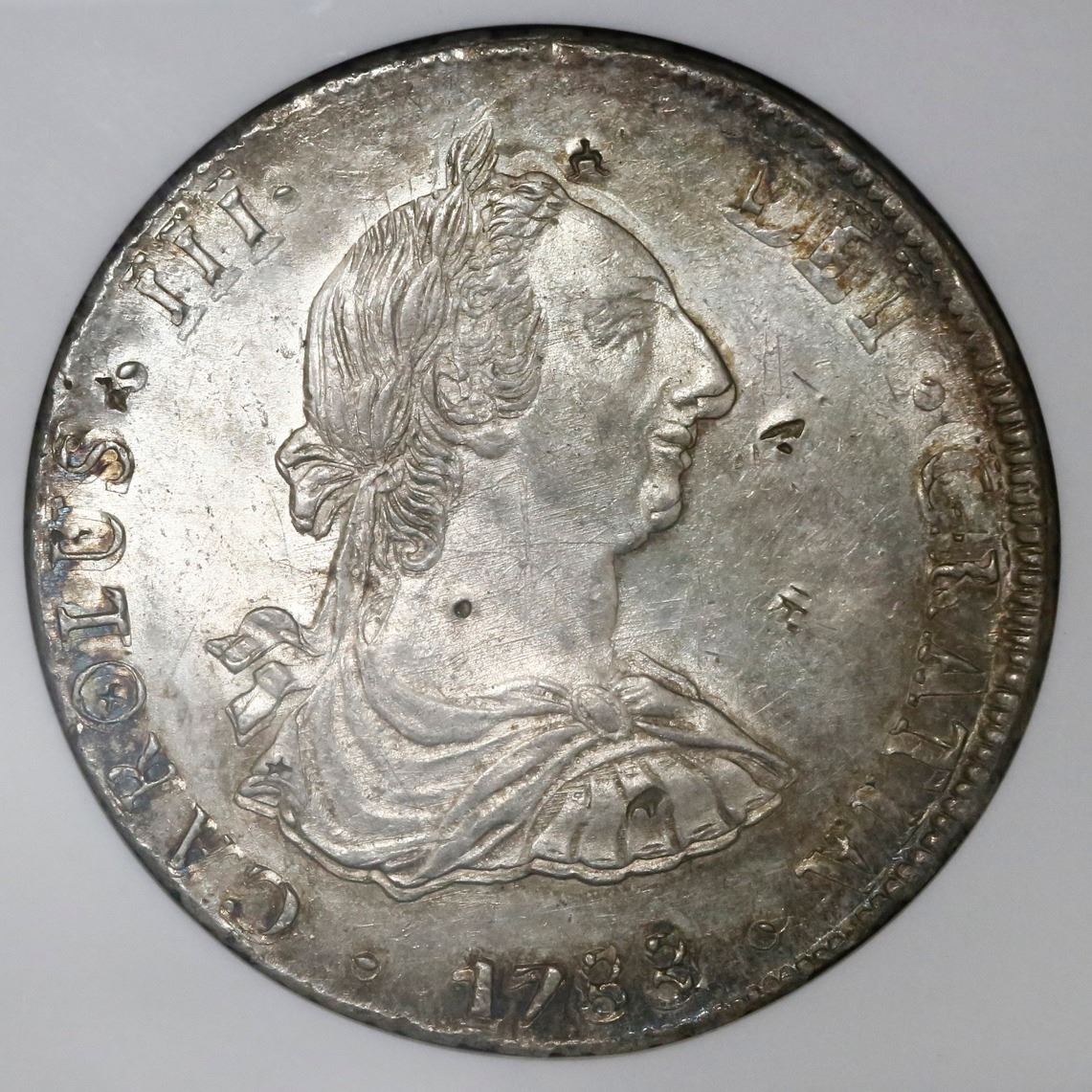 Potosi, Bolivia, bust 8 reales, Charles III, 1788PR, in-collar double strike, with chopmarks as from circulation in China, NGC UNC details / chopmarked. KM-55; CT-997. 26.99 grams. An interesting, high-grade coin exhibiting an in-collar double strike with small degree of rotation (hence the deformed legends and "doubling" around bust) as well as chopmarks, test punches, and even scratched-in Chinese characters from use in Asia. Rather bright with light gold toning that gets darker around the rims. NGC #4704300-004.