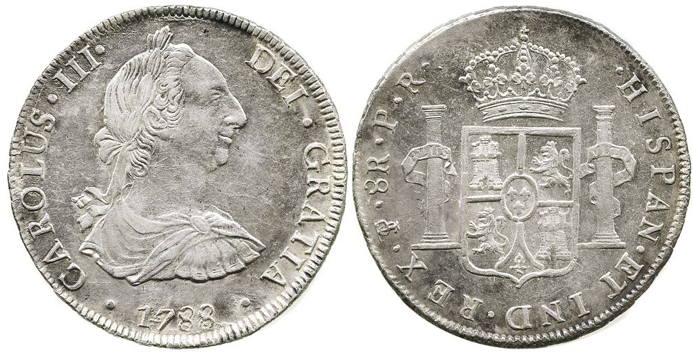 Potosi, Bolivia, bust 8 reales, Charles III, 1788PR. KM-55; CT-997. 27.0 grams. Highly lustrous UNC with traces of toning around rims, faint surface hairlines.