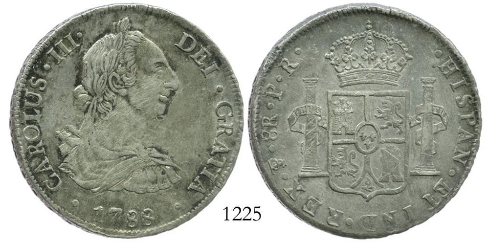 Potosi, Bolivia, bust 8 reales, Charles III, 1788PR. KM-55; CT-997. 27.1 grams. Lustrous XF with subtle rainbow toning, faint old scratches. Pedigreed to the Mark Bir collection.