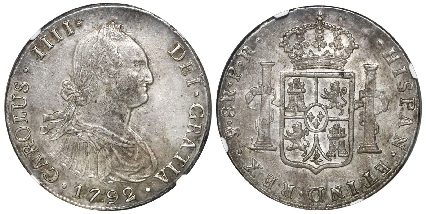 Potosi, Bolivia, bust 8 reales, Charles IV, 1792PR, NGC AU 58. KM-73; CT-713. Typically broad flan with somewhat weak rims, lightly toned over muted luster, minimal high-point wear but some tiny marks, tied with two others for second finest in NGC census behind a single MS 61. Curiously, the reverse axis is rotated about 30 degrees counterclockwise relative to the obverse. NGC #4274525-016.