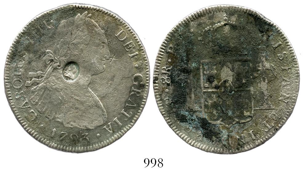 Potosi, Bolivia, bust 8 reales, Charles IV, 1793PR, with English countermark of George III on bust (1797), very rare as from a wreck. KM-73; CT-714. 22.7 grams. The boldest thing on this moderately corroded coin is the countermark in the king's neck, a scarce and popular issue that is almost never found on a wreck, the rest of the coin with fairly clear details, with patches of dark encrustation (especially on the reverse). From: Unidentified early-1800s wreck off Cadiz, Spain