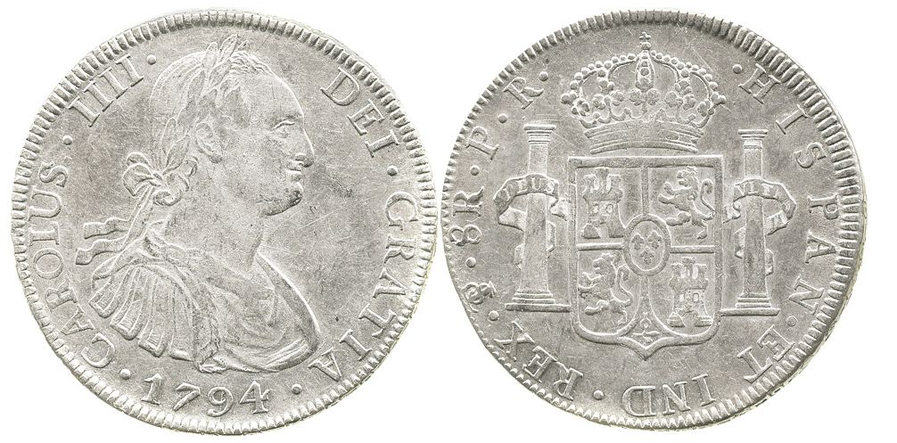 Potosi, Bolivia, bust 8 reales, Charles IV, 1794PR. KM-73; CT-715. 26.8 grams. Lustrous AU with light surface hairlines. Pedigreed to the ca.-1808 "Cuzco hoard" and to our Auction #5 (lot 887).