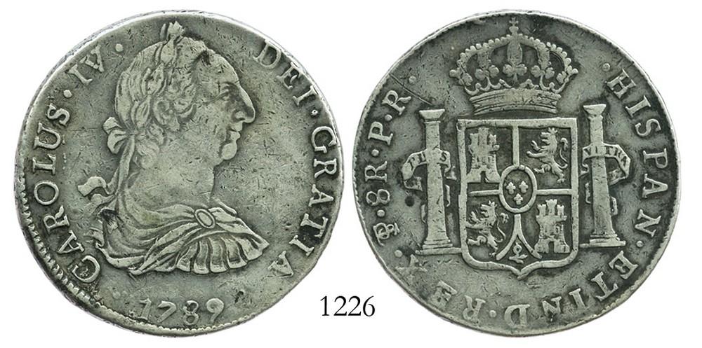 Potosi, Bolivia, bust 8 reales, Charles IV transitional (bust of Charles III, ordinal IV), 1789PR. KM-64; CT-710. 26.8 grams. Fine with lightly toned fields and dark contrast around details, slightly crude rims. Pedigreed to the Mark Bir collection.