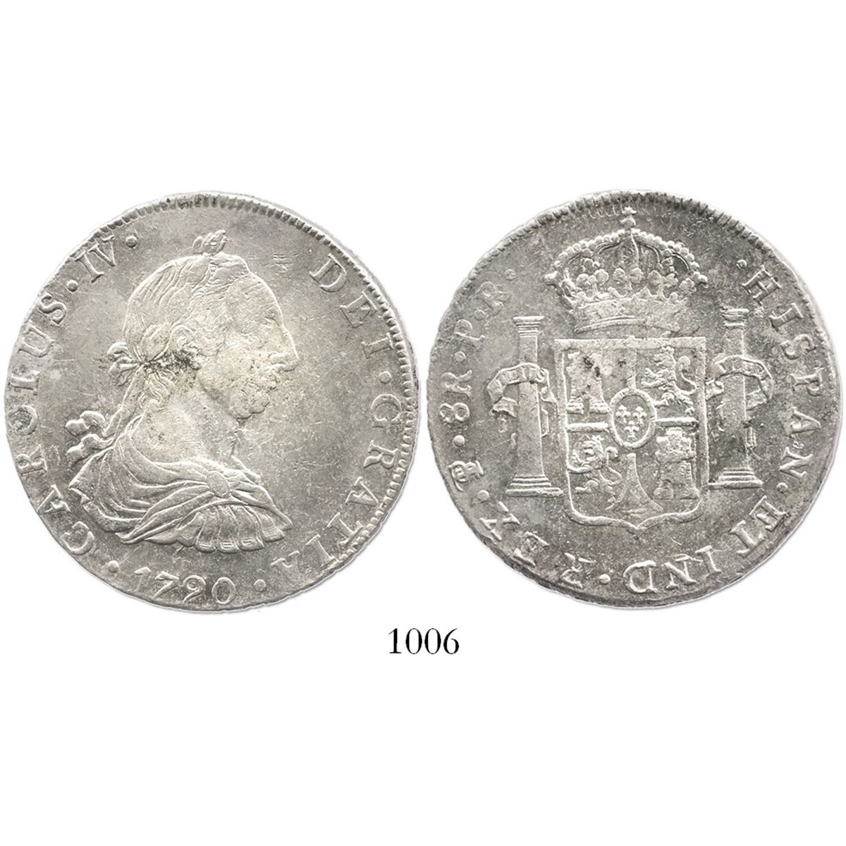 Potosi, Bolivia, bust 8 reales, Charles IV transitional (bust of Charles III, ordinal IV), 1790PR. KM-64; CT-711. 27.0 grams. Lustrous, broad-flan AU-.