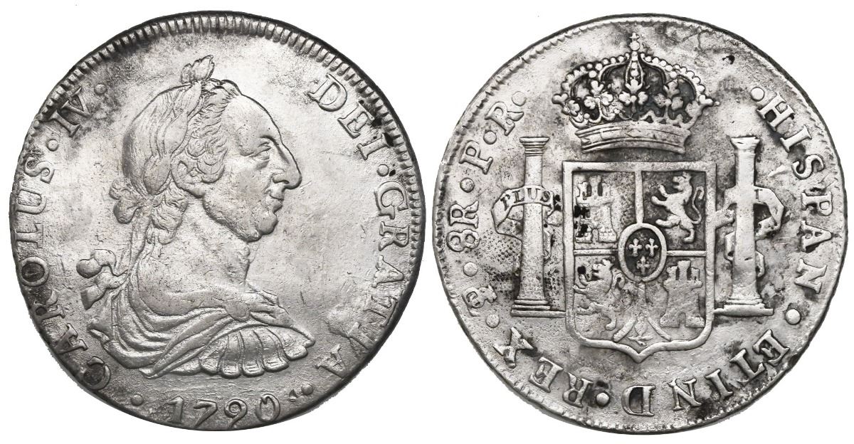 Potosi, Bolivia, bust 8 reales, Charles IV transitional (bust of Charles III, ordinal IV), 1790PR.