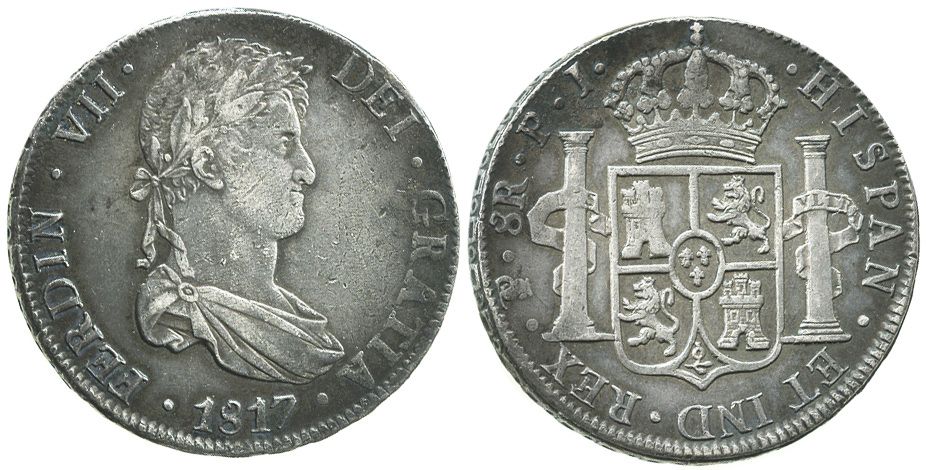 Potosi, Bolivia, bust 8 reales, Ferdinand VII, 1817PJ. KM-84; CT-606. 26.9 grams. Nice XF with deep, dark toning all over, no problems.
