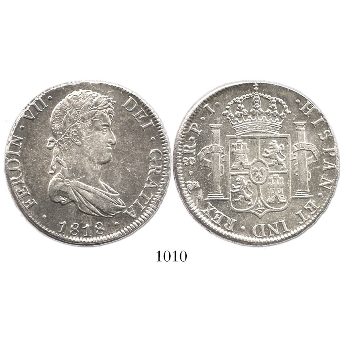 Potosi, Bolivia, bust 8 reales, Ferdinand VII, 1818PJ. KM-84; CT-607. 27.0 grams. Brightly lustrous Mint State, slightly off-center strike.