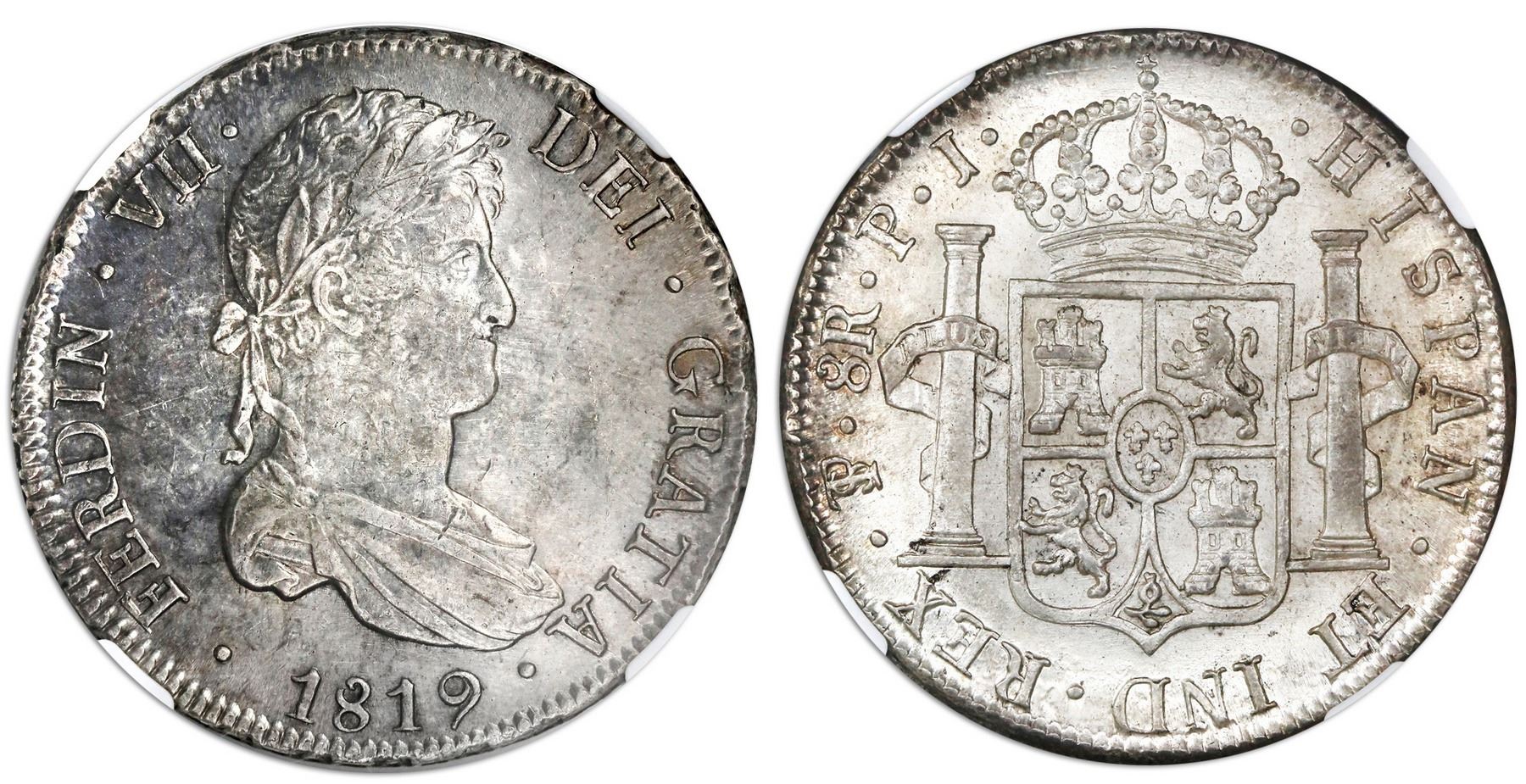 Potosi, Bolivia, bust 8 reales, Ferdinand VII, 1819PJ, NGC MS 63.