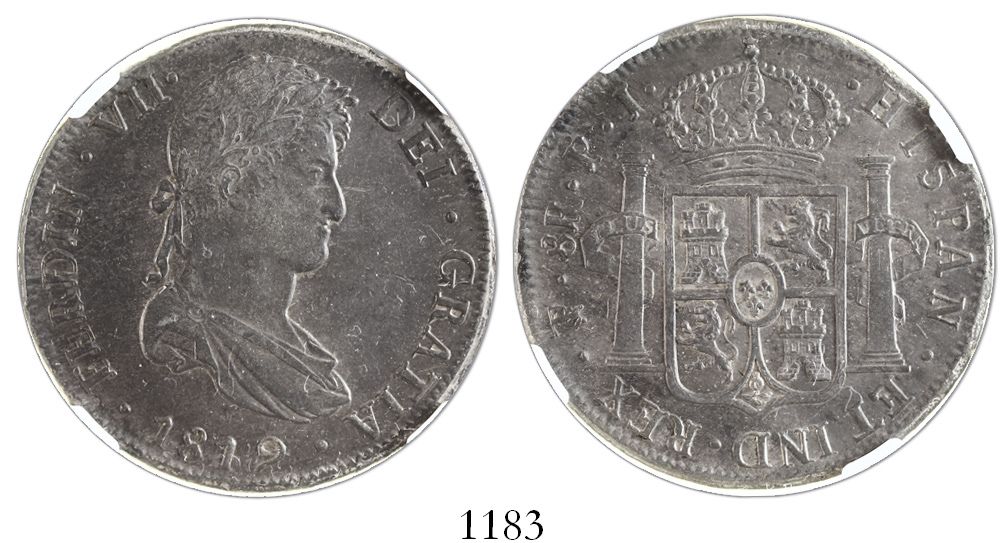 Potosi, Bolivia, bust 8 reales, Ferdinand VII, 1819PJ, encapsulated NGC AU 55. KM-84; CT-608. Bold strike, very richly toned all over, with traces of luster around legends (that luster actually bright on the reverse).