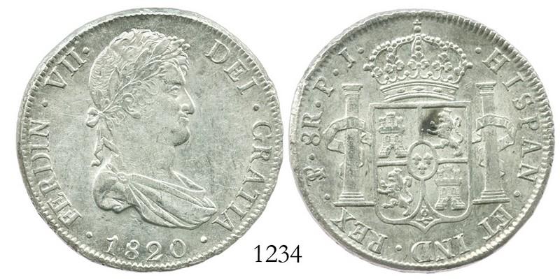 Potosi, Bolivia, bust 8 reales, Ferdinand VII, 1820PJ. KM-84; CT-609. 27.0 grams. BU with high luster, very lightly cleaned, nice rims, dark spot of toning in center of reverse.