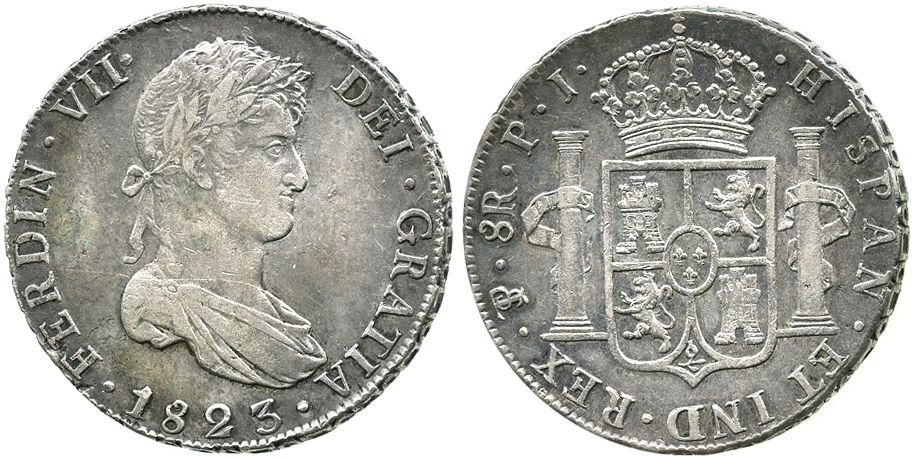 Potosi, Bolivia, bust 8 reales, Ferdinand VII, 1823PJ. KM-84; CT-613. 26.8 grams. Nicely toned XF with hint of luster, practically no rims (as made).