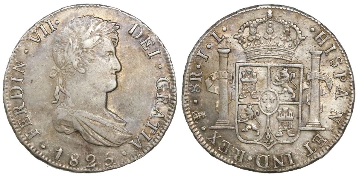 Potosi, Bolivia, bust 8 reales, Ferdinand VII, 1825JL, final date of colonial issues.