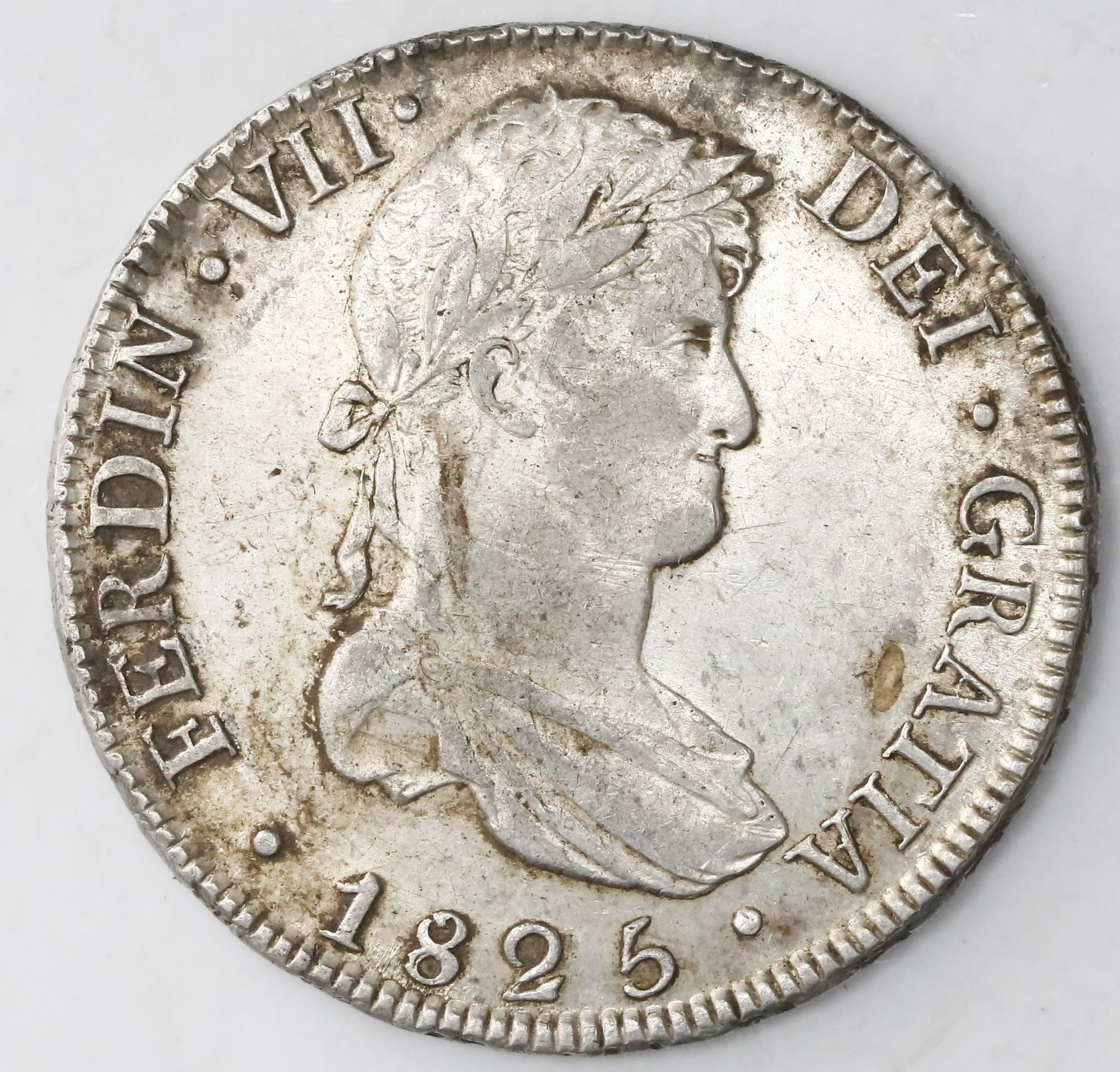 Potosi, Bolivia, bust 8 reales, Ferdinand VII, 1825JL. KM-84; CT-618. 26.94 grams. Boldly struck AU with light scratches and surface sediment, still quite lustrous.