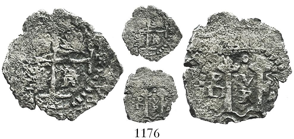 Potosi, Bolivia, cob 1/2 real, (1652)E transitional Type IId, scarce. S-P37; KM-A12.3; CT-Type 262. 1.0 gram. Full and bold pillars with motto as P-LV-SV / LT-R-A, nearly full cross, nicely toned, salvaged XF, slightly crude edge (as made).