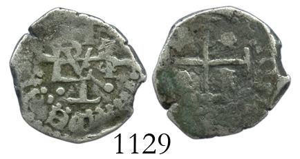 Potosi, Bolivia, cob 1/2 real, (1656), one-year type with cross-backed monogram. S-P37a; KM-A12.7; CT-1169. 2.1 grams. As one of the final experiments in the transition begun in 1652, the half reales of 1656 uniquely show crosses on both sides (with the date relegated to the rarely seen legend), one with lions and castles and the other superimposed by the monogram, which is full and bold on this example, the cross-lions-castles nearly full too, toned Fine+ with dark patina.