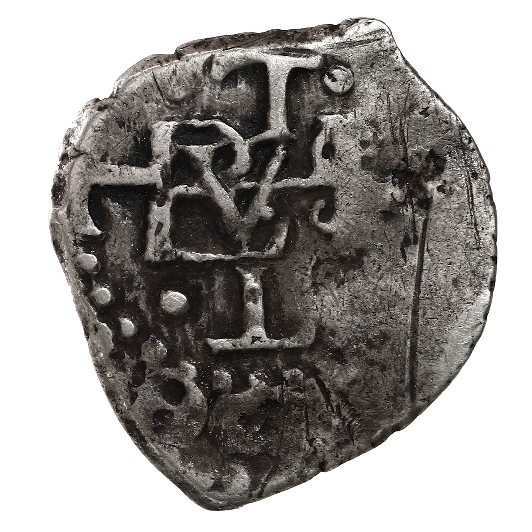 Potosi, Bolivia, cob 1/2 real, (1656), rare. S-P37a; KM-13; Cal-580. 1.67 grams. Rare one-year design with cross on monogram side. VF with scratch on obverse.