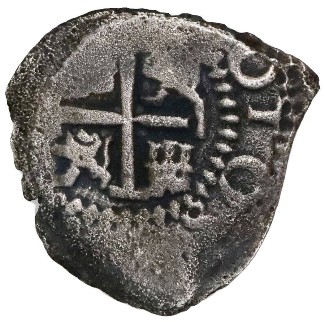 Potosi, Bolivia, cob 1/2 real, 1666(?)E, dot-pomegranate-dot at top. S-P37a; KM-13; Cal-597. 1.61 grams. Bold Philip IV monogram with 100% full dot-pomegranate-dot at top, clear 66 of date with last digit too weak to discern, choice full cross with dark, contrasting toning, minimal corrosion. With ROBCAR photo-certificate #M20194. Recovered from: Consolacion, sunk in 1681 off Santa Clara Island, Ecuador