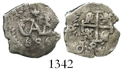Potosi, Bolivia, cob 1/2 real, 1686. S-P40; KM-22. 1.6 grams. Superb full cross-lions-castles, full monogram and date and pomegranate, VF with toned fields, edge slightly crude (as made).