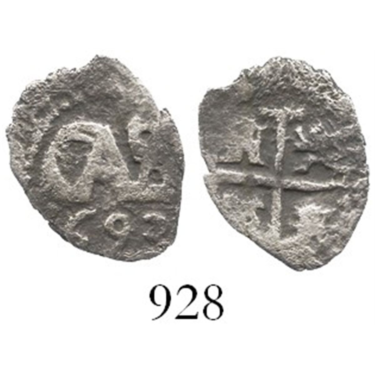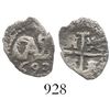 Potosi, Bolivia, cob 1/2 real, 1693. S-P40; KM-22; CT-844. 0.8 gram. Full monogram and date, nearly full cross despite minor corrosion loss as salvaged, Fine otherwise.
