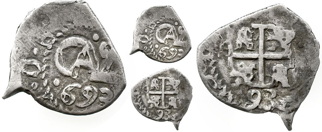 Potosi, Bolivia, cob 1/2 real, 1693. S-P40; KM-22; CT-844. 1.6 grams. Curious shape (like a chocolate chip with sharp point at top), and a choice specimen with full monogram and cross and 2 dates (rare thus), richly old-toned VF+.