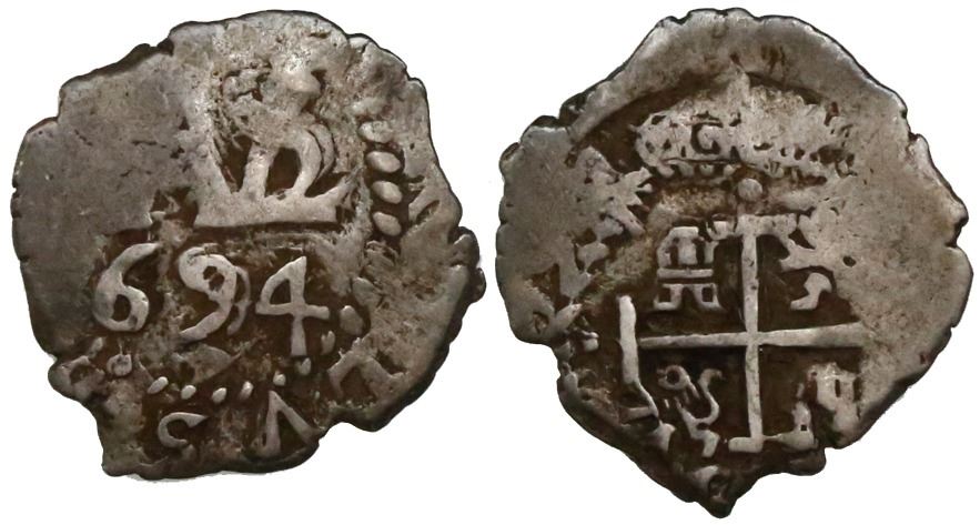Potosi, Bolivia, cob 1/2 real, 1694. S-P40; KM-22; CT-845. 1.99 grams. Broad flan with choice full date and cross (slightly off-center), attractively toned XF.