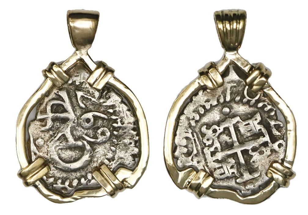 Potosi, Bolivia, cob 1/2 real, 1697, mounted in 18K gold bezel. 3.83 grams total. Choice coin with full cross-lions-castles and monogram and date on a slightly teardrop-shaped flan mounted with point at top (cross slightly off-axis), VF details, heavy prongs for the size. With photo-certificate, the coin pedigreed to our Auction #20 (lot #1990).