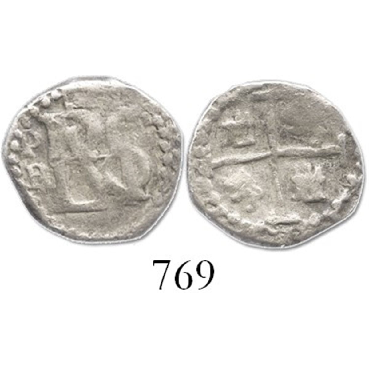 Potosi, Bolivia, cob 1/2 real, Philip III, assayer R (curved leg). S-P15; KM-6.1; CT-560. 1.6 grams. Roundish Fine+ with clear P-R to left, bold full monogram and cross.