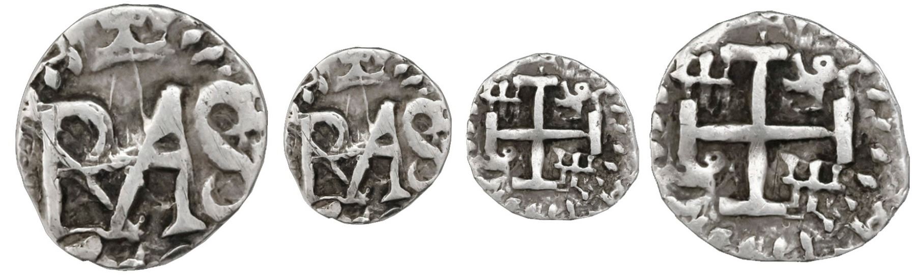 Potosi, Bolivia, cob 1/2 real Royal (galano), Philip V, date not visible, rare. 1.56 grams. Almost perfectly round and with bold and evenly struck details, albeit on a flan that is too small for anything in the periphery, including--amazingly--the date! The net result is that the monogram and cross-lions-castles are choice, and there is no question that this is a presentation piece, but we cannot attribute it to a particular date. Nicely toned XF+.