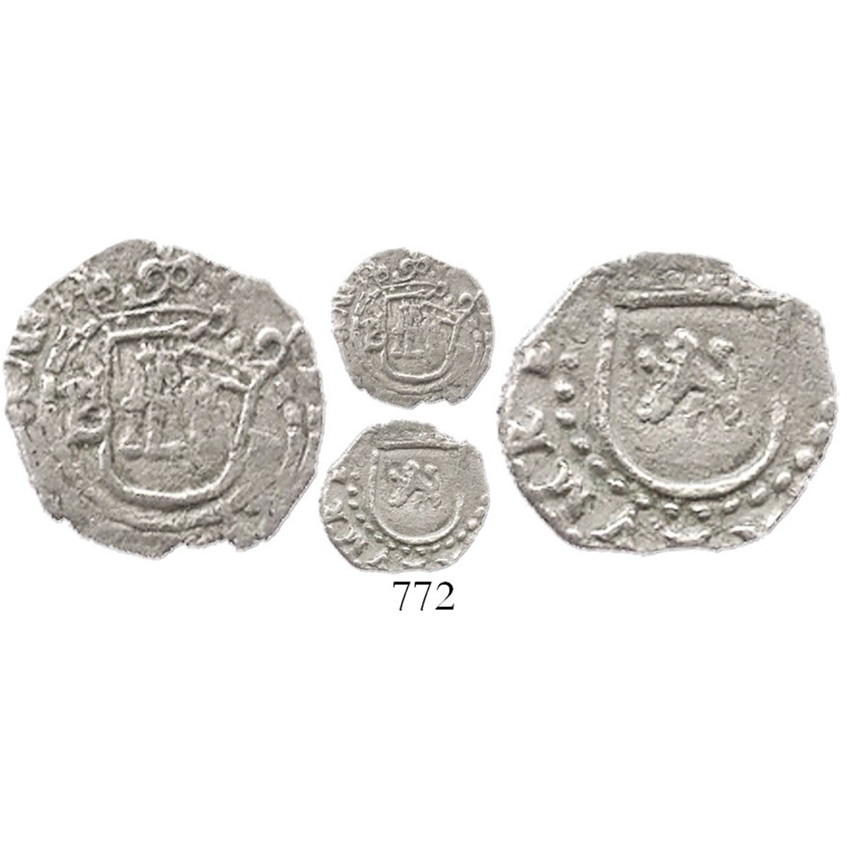 Potosi, Bolivia, cob 1/4 real, Philip II, assayer B to left, mintmark P to right (5th period), rare. S-P14; KM-B1; CT-770. 0.8 gram. Nice VF with full crown above full castle (doubled), full lion, some bold legend, lightly toned.