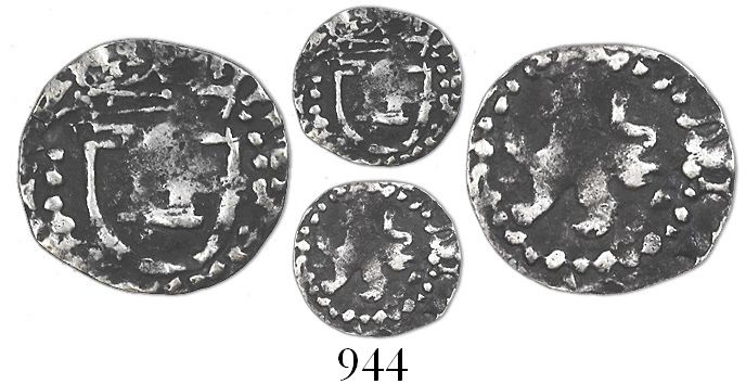 Potosi, Bolivia, cob 1/4 real, Philip III, no assayer, very rare. 0.65 gram. Full but weak lion (no shield), nearly full crown above weak castle in shield, toned AVF.
