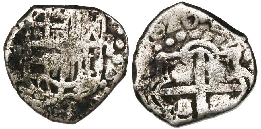 Potosi, Bolivia, cob 1 real, 1626P, quadrants of cross transposed, extremely rare. S-P23; KM-12a; CT-1022. 2.74 grams. Small flan with crude details but clear date and assayer and date, VG with small black spots.