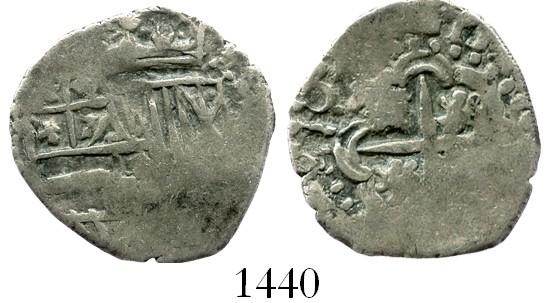 Potosi, Bolivia, cob 1 real, 164(1?), assayer not visible, 2R-sized shield, rare. KM-12a; CT-1035. 3.7 grams. Broad flan with shield to match, but cross-side die proves it is actually a 1R, with full 16 and left piece of 4 of date, crude Fine with much flatness.