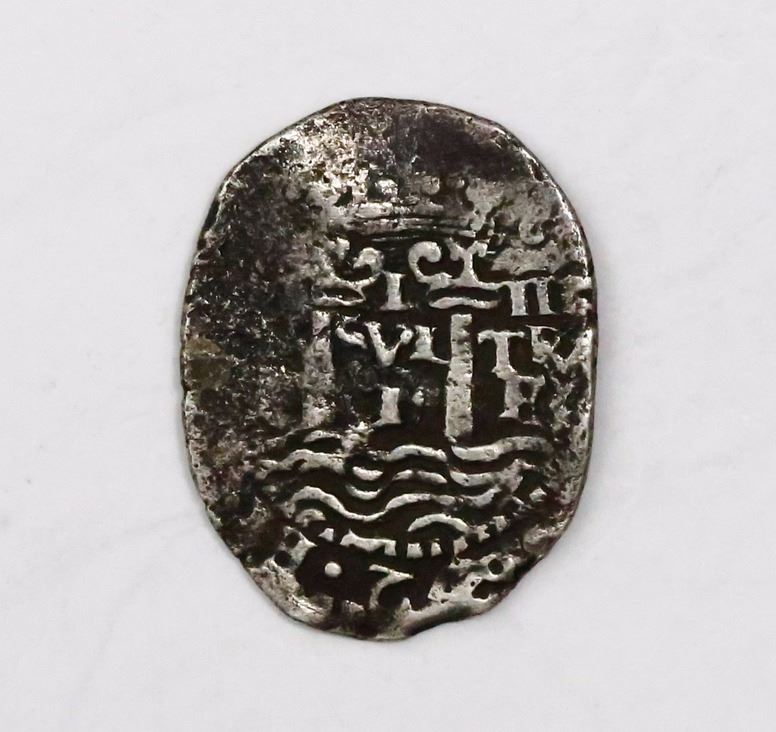Potosi, Bolivia, cob 1 real, 1652E Transitional Type II, rare. S-P37; KM-B13.2; CT-unl. 2.56 grams. Oval flan, somewhat thin but minimally corroded, with full pillars-and-waves with date in legend, full shield with bold I-O-E-2 to right, most of king's name, toned fields. Recovered from: Capitana, sunk in 1654 off Chanduy, Ecuador